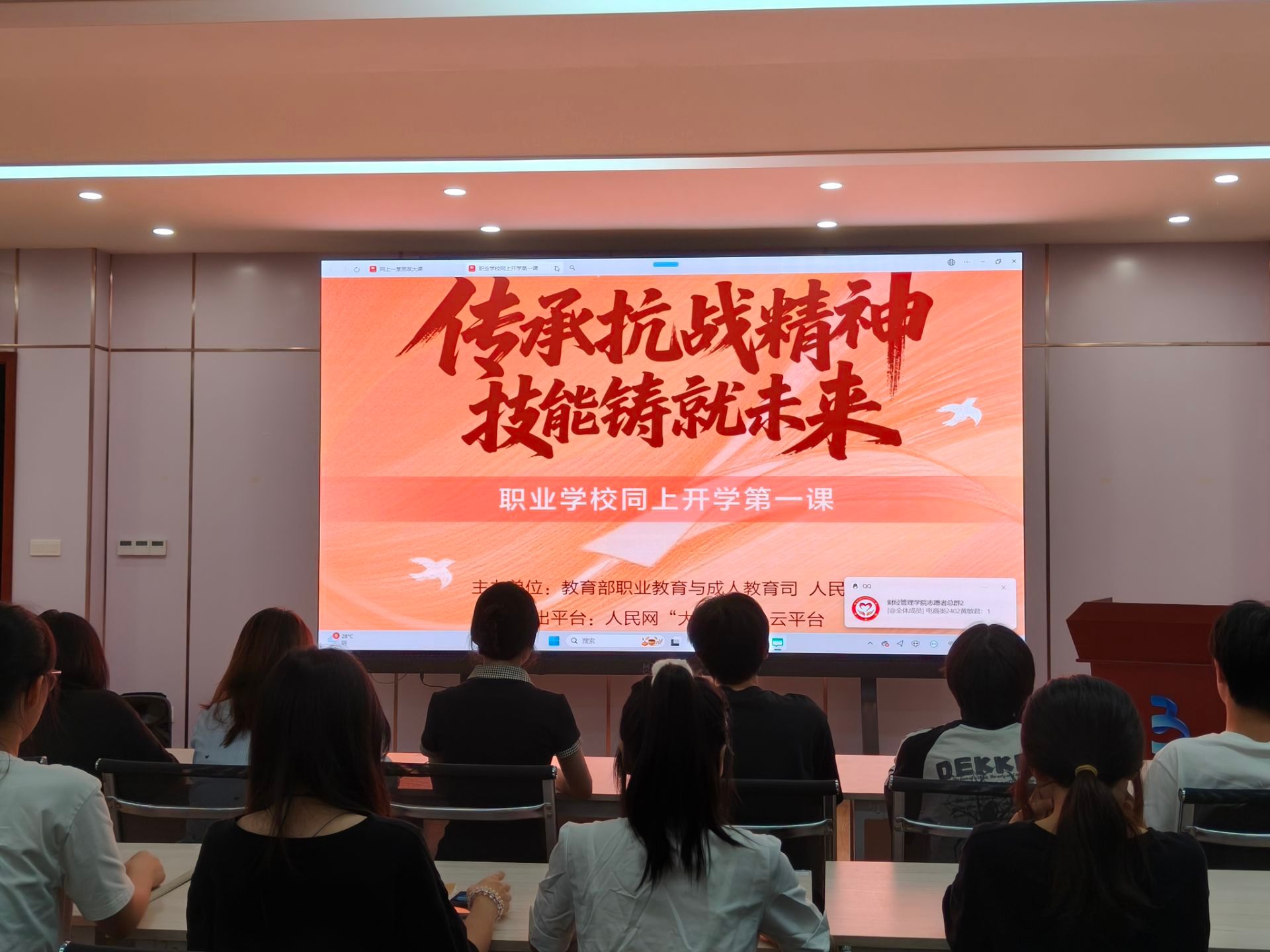 为庆祝中国人民抗日战争暨世界反法西斯战争胜利八十周年,深切缅怀革命先烈,传承伟大抗战精神,2025年9月11日晚,数字经济与管理学院组织学生骨干共同学习了一堂意义非凡的“传承抗战精神,技能铸就未来”云端思政大课。 学习中,同学们保持专注,目光聚焦屏幕,紧跟课堂节奏,捕捉抗战历史中的精神内核与职业技能发展的契合点,将“天下兴亡,匹夫有责”的爱国情怀、“不畏艰难、百折不挠”的抗战意志转化为钻研专业知识、......